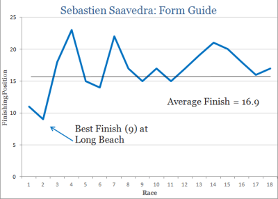 Sebastien Saavedra had a season to forget in 2014, never finishing a race above ninth. Saavedra did achieve one pole position start this year, which came at the Indianapolis G.P. (which he would crash out of on lap one). His best result came at Long Beach where he was able to put his KVAFS racing machine into the top ten and lead three lap during the race. Birmingham was the only other track where he was able to lead laps in 2014 (14 in total).