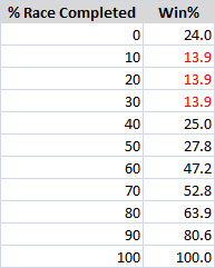 You’ll notice that the win expectancy actually drops off from the initial 24 percent during the 10-30 percent of the race completed stages. Why would the driver in first be less likely to win the race when 10 percent of the race is completed than when he started on pole (and thus had more of the race left to complete)?