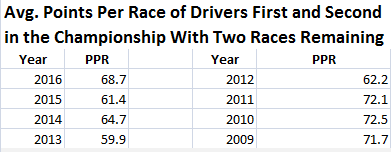 To see if this is actually unusual or simply the norm, I went back to all seasons 2009 and on and checked how many points per race the top two contenders were averaging together with two races remaining. I adjusted to account for double points races by making them count for two races.