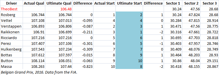 Here’s a look at the data in full from Belgium for the top ten drivers who qualified. The light blue column shows where the driver would have started if the grid was set using TB lap times. I’ve also included a driver “TheoBest” in red whose time is the best sector times of the session not necessarily from the same driver. For this race TheoBest is made up of Rosberg for sectors one and three and Verstappen for sector two.