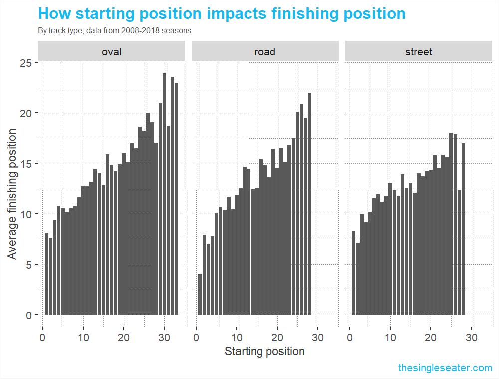 The highest average finishing position (AFP) comes on road courses when starting on the pole, which yields an AFP of 4th place. Starting up high on road and street courses is more beneficial than doing so on ovals it appears. This is likely due to a combination of two things: