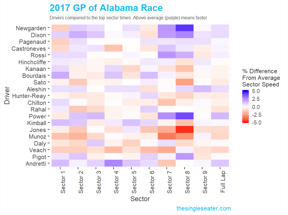 Here is the sector heatmap and a trackmap for the race at Barber in 2017: