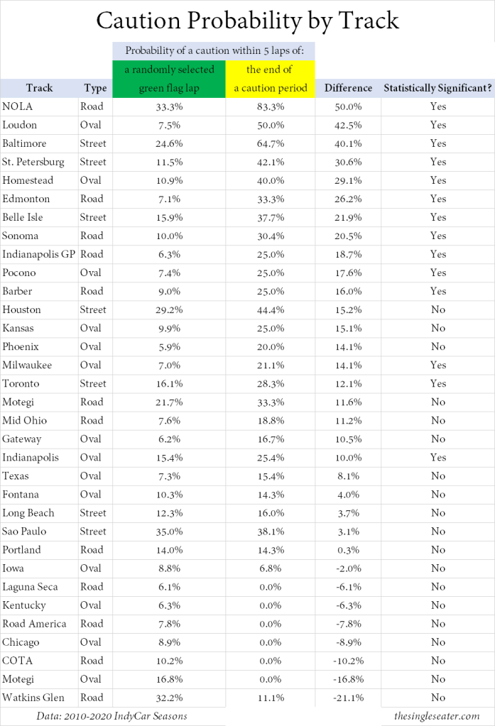 I also broke down this analysis by individual tracks and those results are presented in the table below. Keep in mind the column that says whether or not the difference is statistically significant. A lot of the tracks on this list have a small sample size of cautions that prevent us from making too many strong conclusions about that specific track. Other tracks, like Indianapolis and St. Petersburg, for example, have plenty of cautions and green flag laps run for us to make conclusions from.